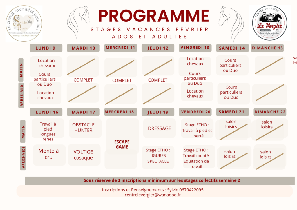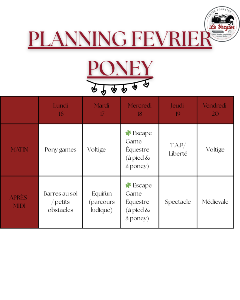 Vous trouverez ci dessous le planning des vacances de Février avec les dates de stages poney ou chevaux