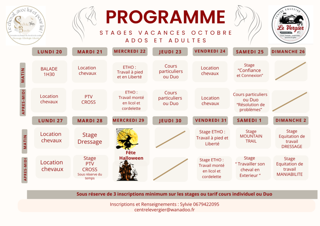 Des stages à la 1/2 journée, journée ou semaine complète sont organisés pendant les vacances du 21 au 25 et du 28 au 30 octobre: renseignez-vous!