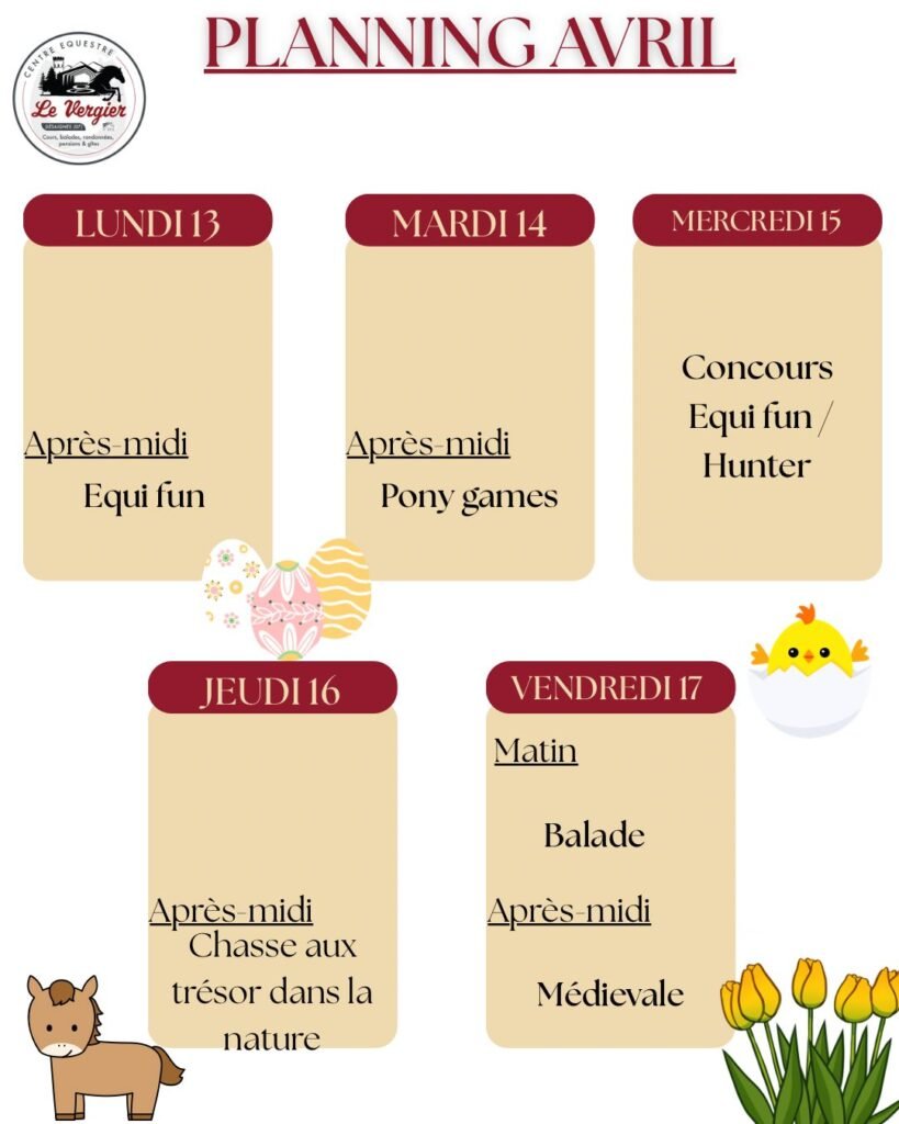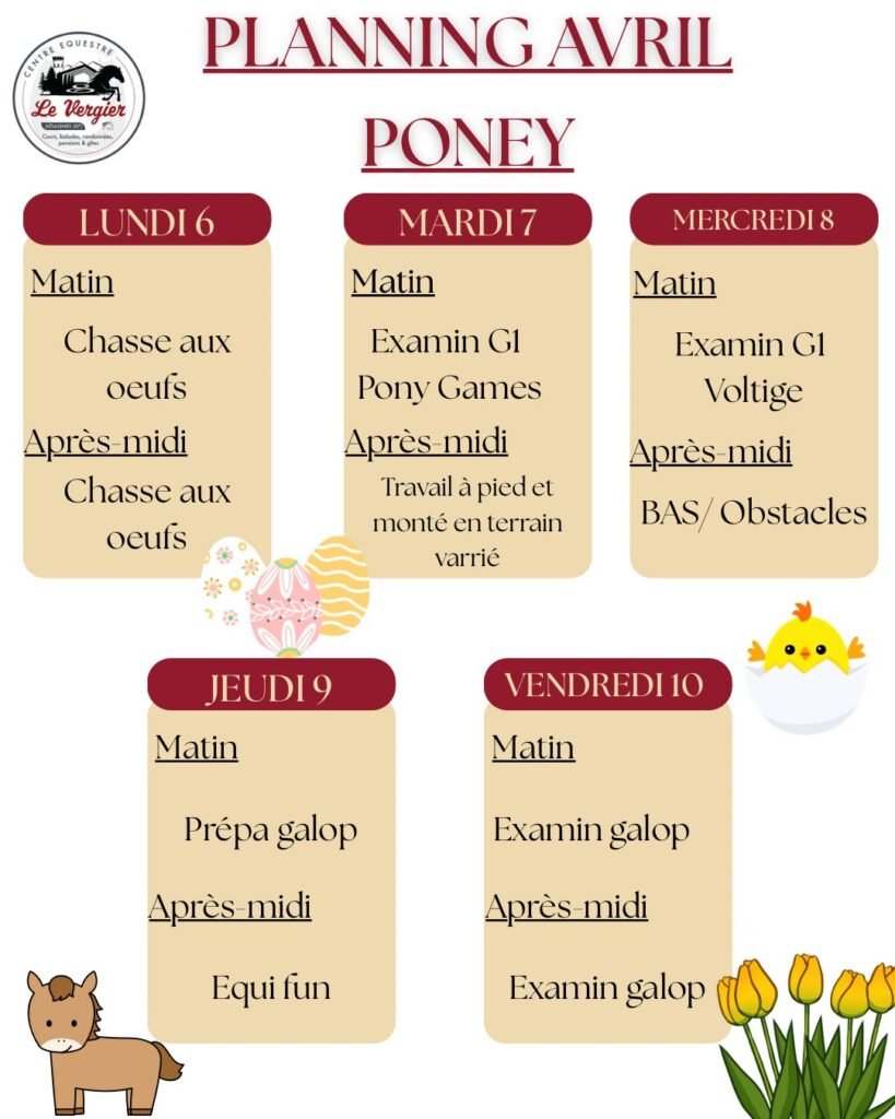 Lundi, mardi, jeudi et vendredi de 9H à 12H niveaux : Poney d’or, Galop 1 et 2 et 3 de 13h30 à 16H30 : Galop 1/2 et Galop 3/4